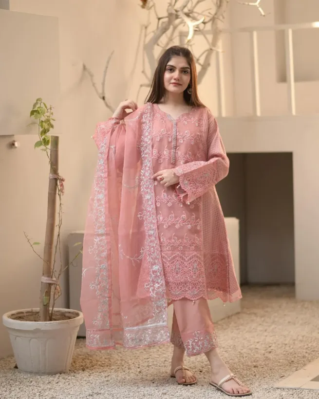 A stunning three piece organza suit in Dusky Pink.