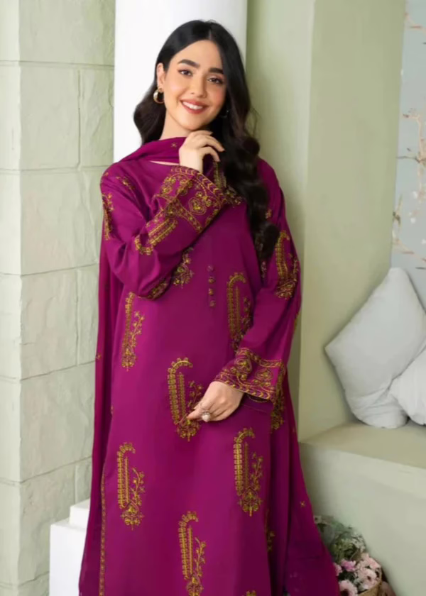 Luxurious Purple Embroidered 2-Piece Set. Indulge in luxury with our beautifuly embroidered two-piece set in a stunning magenta colour . The intricate embroidery adds a touch of elegance to this ensemble. The backside is and trouser is plain.