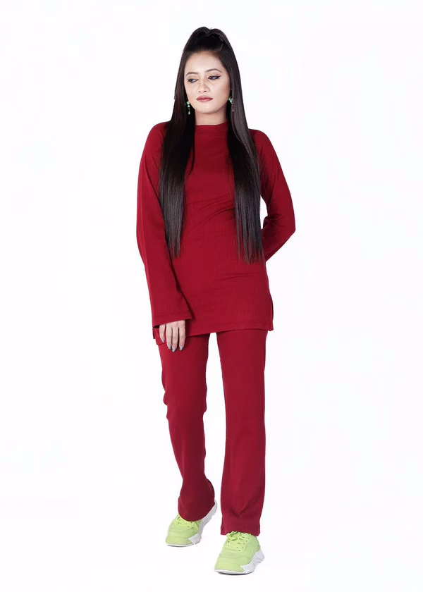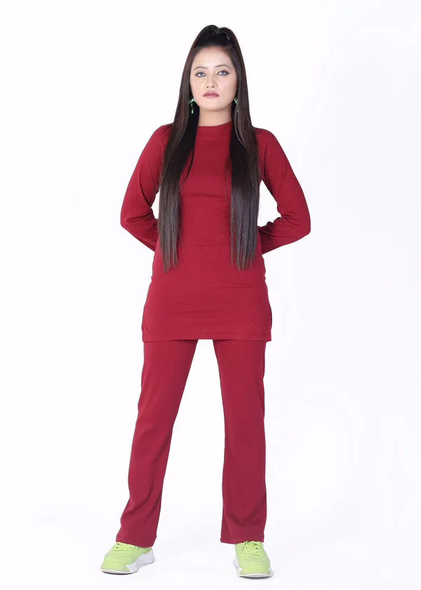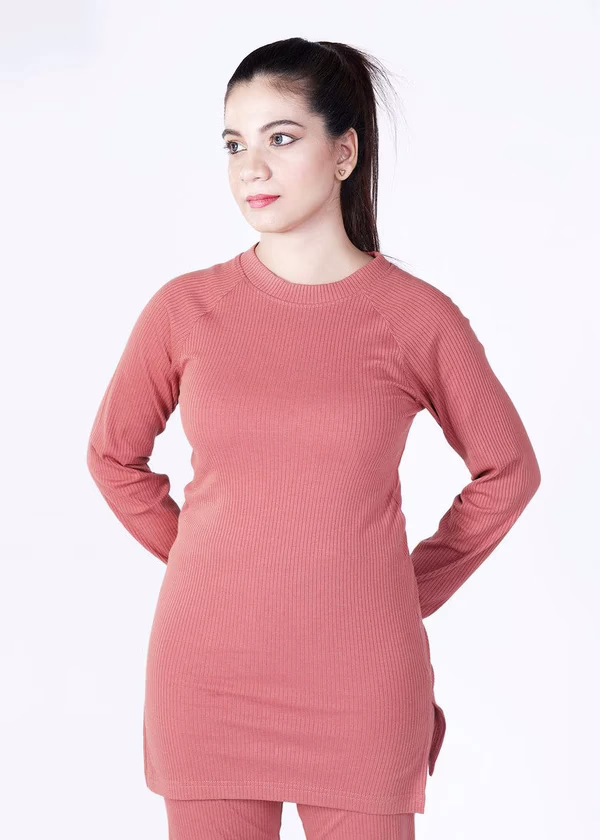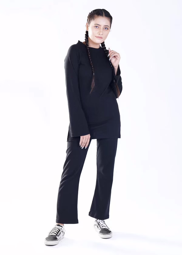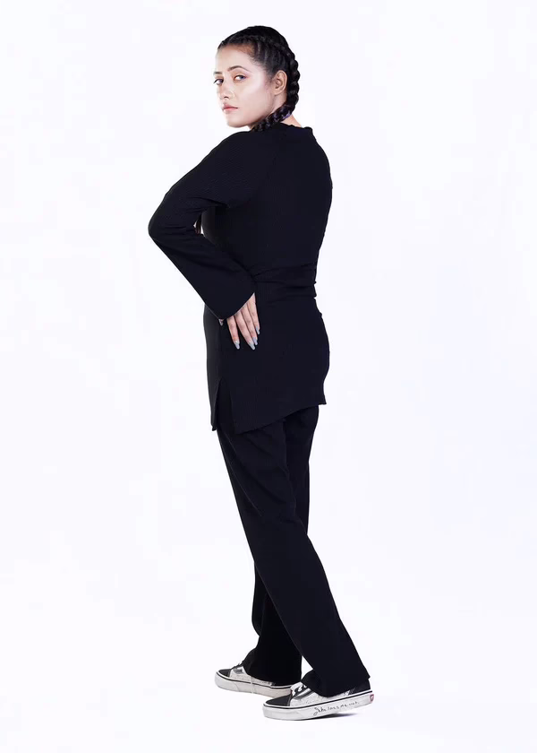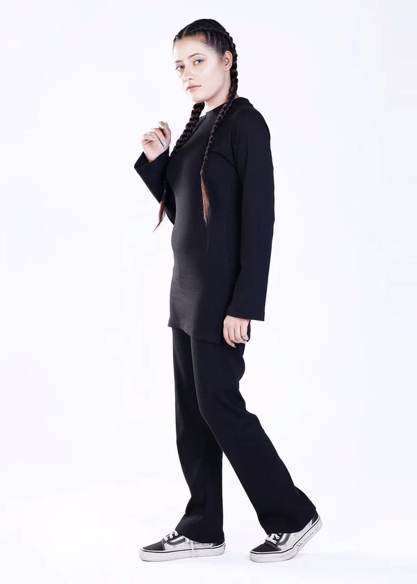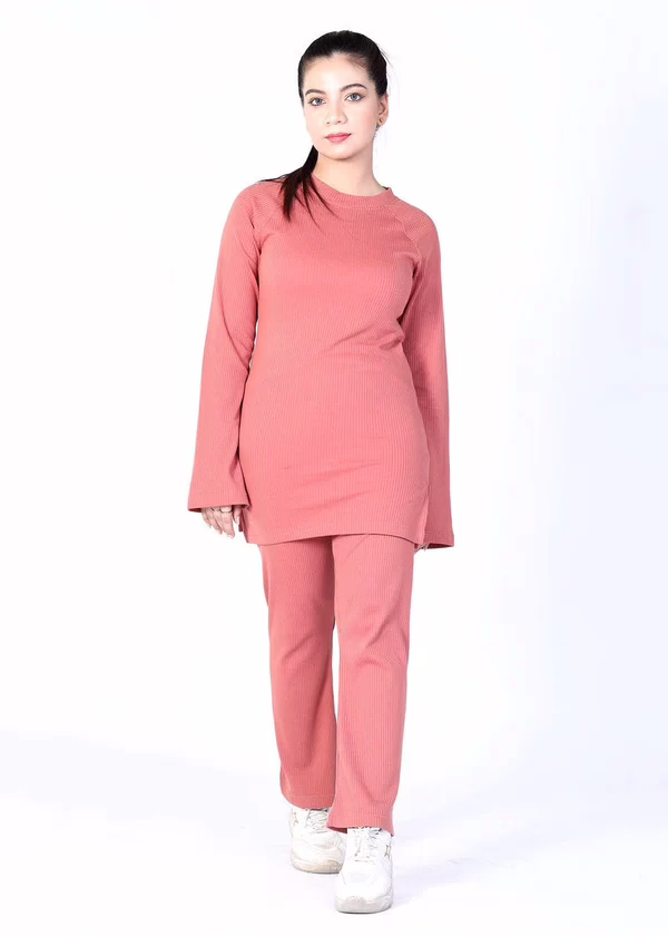 Embrace laid-back luxury with this soft ribbed knit tunic and trouser co-ord set.