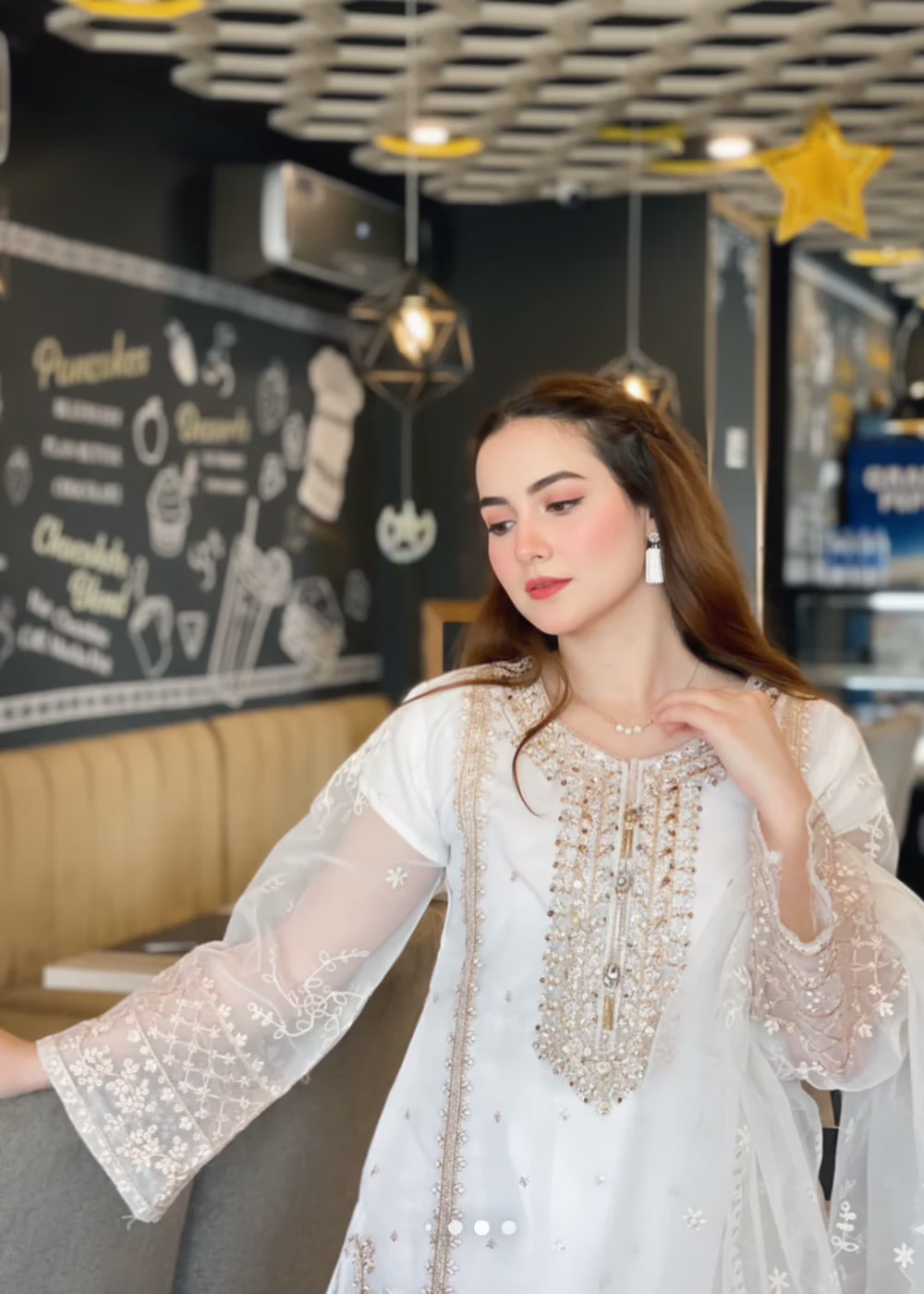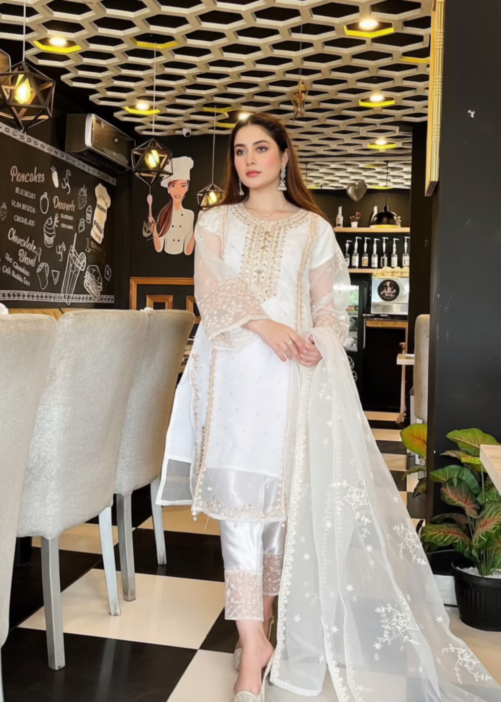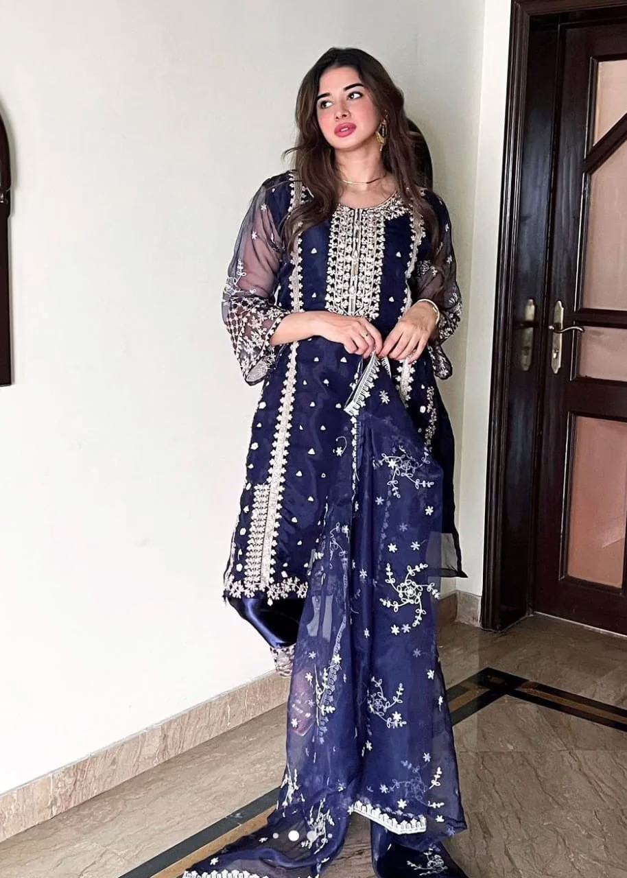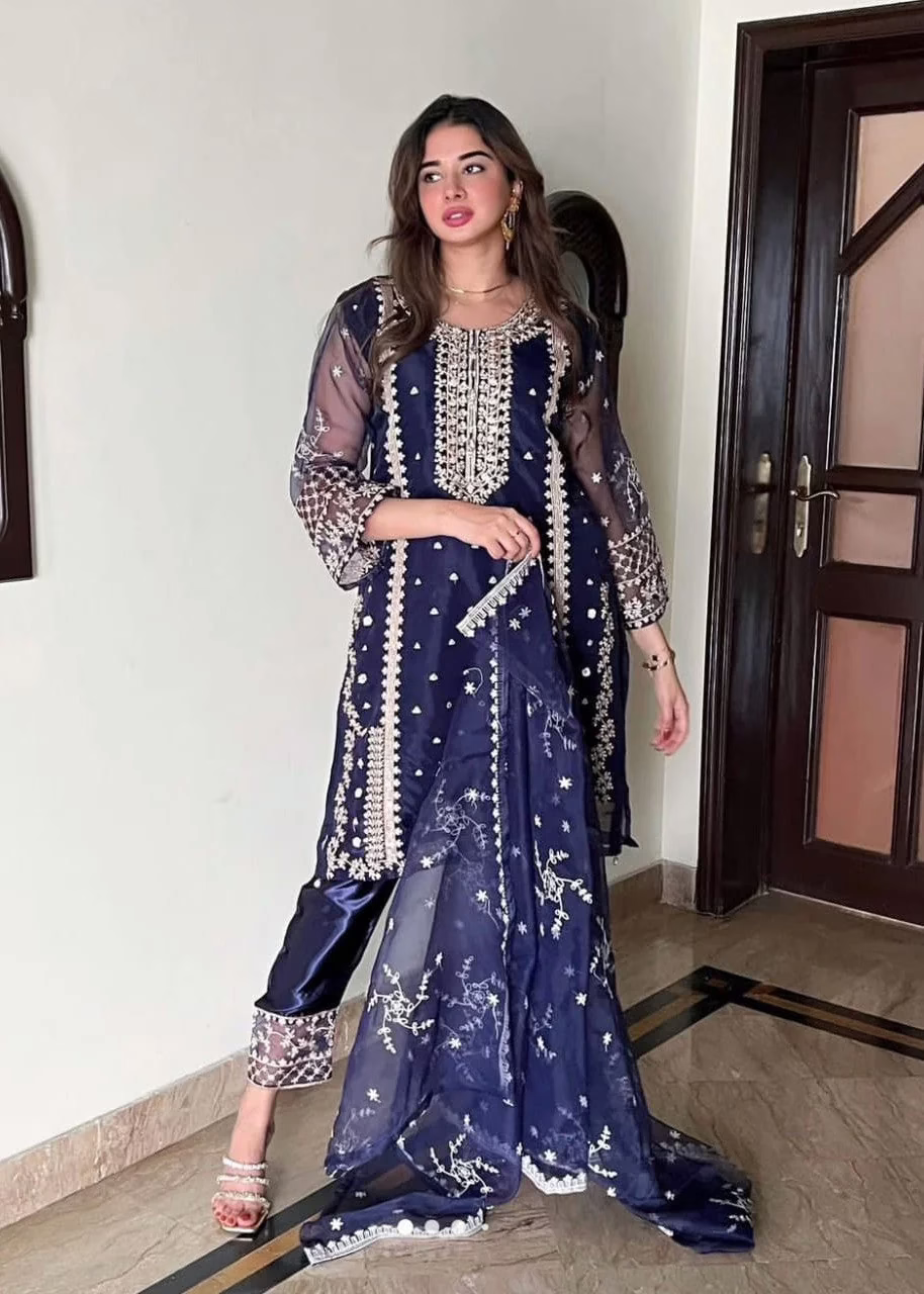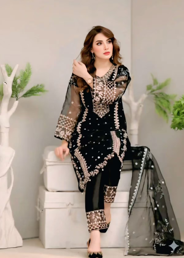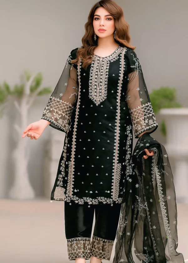 Crafted from luxurious organza, this elegant suit features delicate, intricate embroidery that adds a timeless touch. The light and sheer fabric drapes beautifully, while the fine threadwork enhances its graceful appeal. Perfect for weddings, festive occasions, or special events, this suit combines tradition with modern style, ensuring you stand out with elegance..