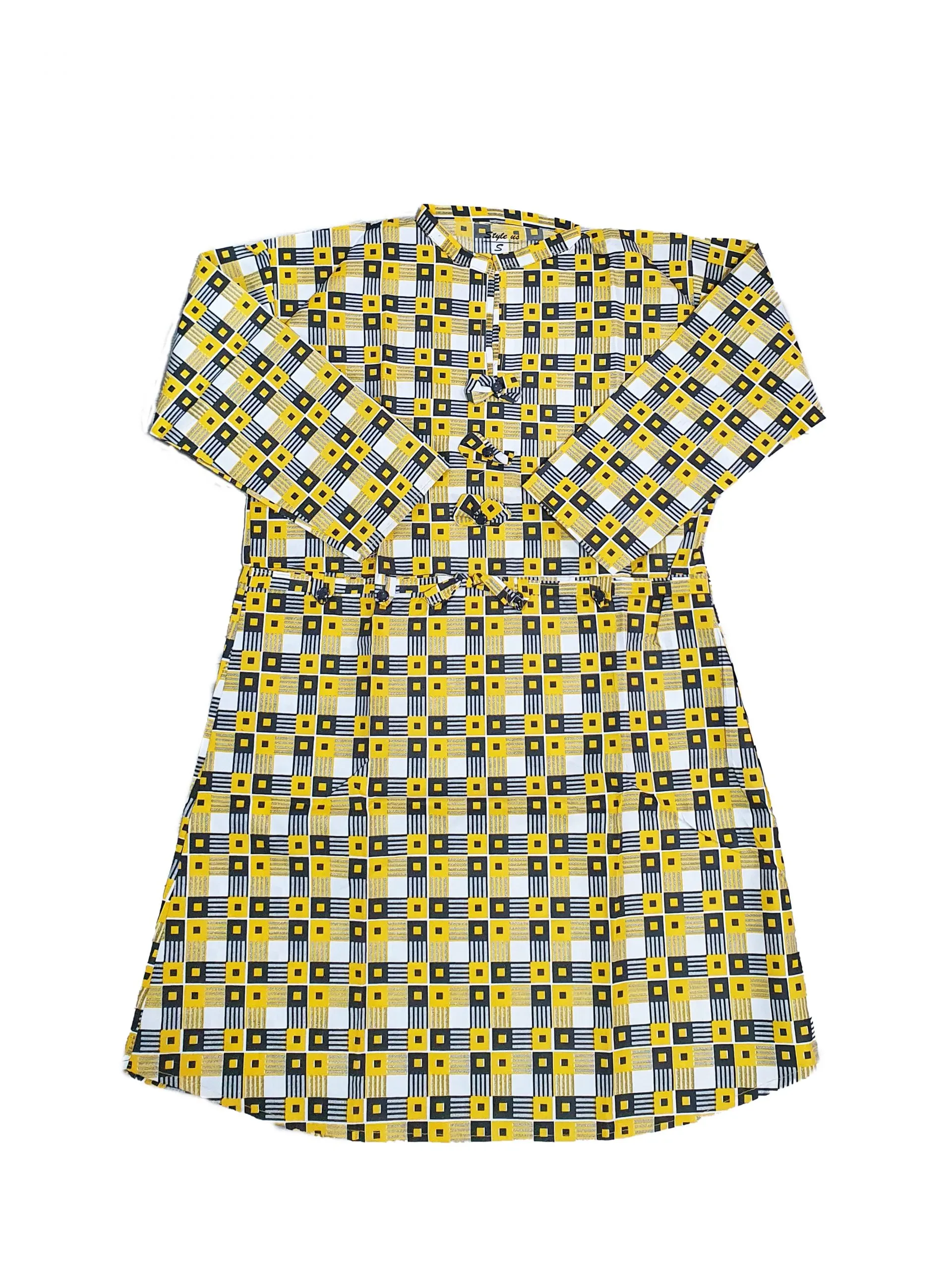 Stand out from the rest by styling this mustard patterned shirt dress by Style Us. A pretty bow design on the front. Waist buttoned tie belt.